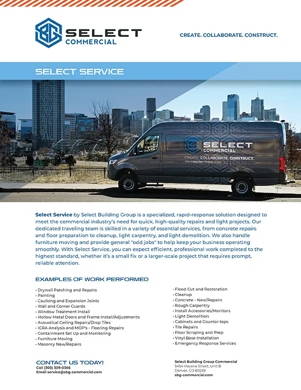 Select Service by Select Building Group is a specialized, rapid-response solution designed to meet the commercial industry’s need for quick, high-quality repairs and light projects. Our dedicated traveling team is skilled in a variety of essential services, from concrete repairs and floor preparation to cleanup, light carpentry, and light demolition. We also handle furniture moving and provide general “odd jobs” to help keep your business operating smoothly. With Select Service, you can expect efficient, professional work completed to the highest standard, whether it’s a small fix or a larger-scale project that requires prompt, reliable attention.